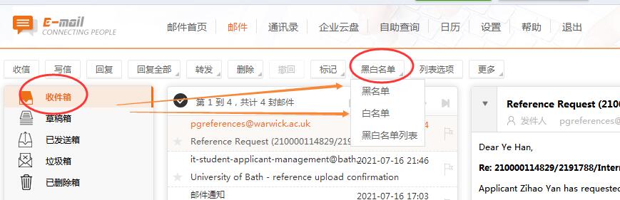 3、進(jìn)入“收件箱”頁(yè)后,在上方一排按鈕中有個(gè)“黑白名單”,先下右下角小三角
