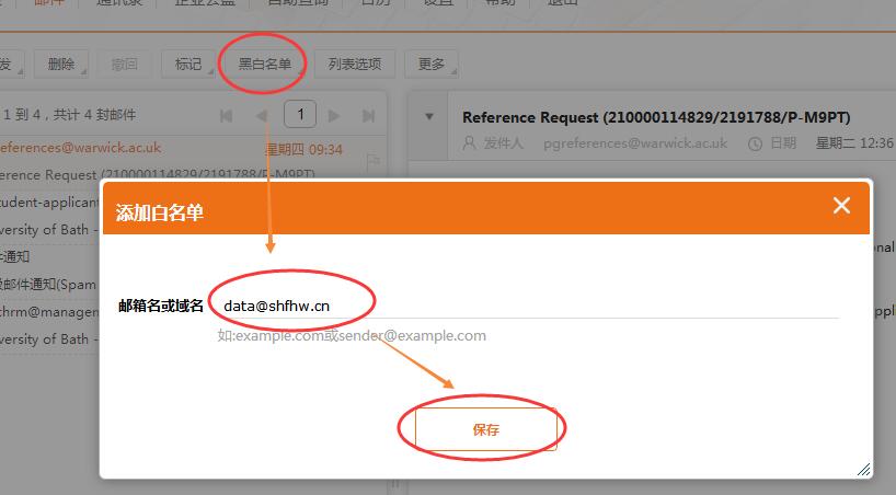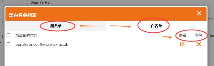 5、查詢已添加過的“白名單”或“黑名單”,在列表中可以刪除已添加郵件。