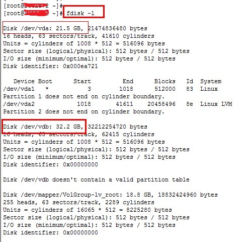 1、首先查看系統(tǒng)中磁盤信息,命令為:fdisk -l 輸入后顯示的:"Disk /dev/vda: 21.5 GB",即為系統(tǒng)盤,名稱為vda,另外還有一塊磁盤是沒(méi)有格式化,沒(méi)有分區(qū),沒(méi)有在使用中的:"Disk /dev/vdb: 32.2 GB",如圖1所示: