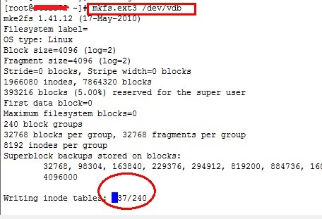 2、將未使用的磁盤進(jìn)行格式化,操作數(shù)據(jù)盤符前,請(qǐng)自行確認(rèn)磁盤是否有使用過(guò),如有重要數(shù)據(jù)請(qǐng)謹(jǐn)慎操作,以免導(dǎo)致數(shù)據(jù)丟失,帶來(lái)不必要的麻煩。具體格式化命令為: mkfs.ext3 /dev/vdb 如圖2所示,即為正在格式化中。這個(gè)時(shí)候請(qǐng)耐心等待格式化完畢。