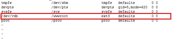 4、修改fstab,以便系統(tǒng)啟動(dòng)時(shí)自動(dòng)掛載磁盤,編輯fstab默認(rèn)啟動(dòng)文件命令: vi /etc/fstab 回車在其中添加一行: /dev/vdb /wwwroot ext3 defaults 0 0 如圖3所示,在fstab中添加的一行,添加后,保存。